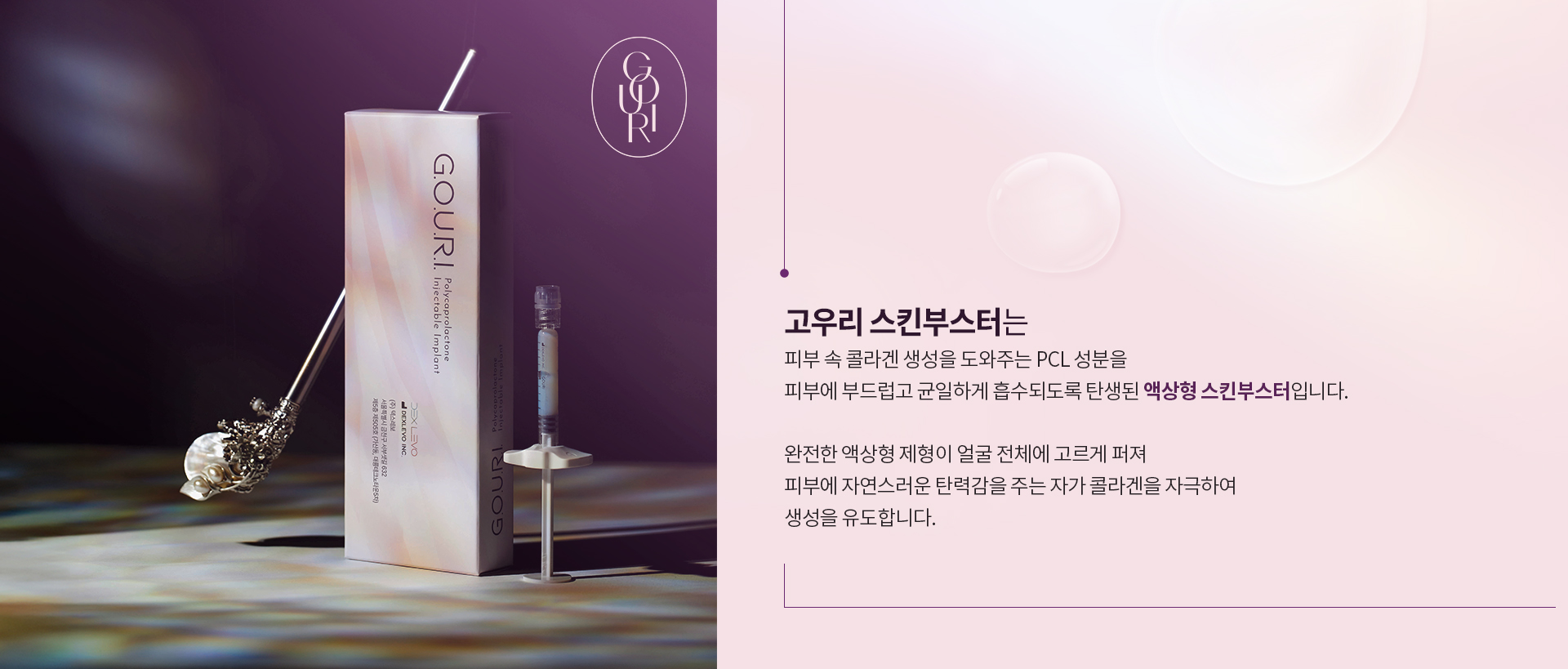고우리 스킨부스터는 피부 속 콜라겐 생성을 도와주는 PCL 성분을 피부에 부드럽고 균일하게 흡수되도록 탄생된 액상형 스킨부스터입니다.