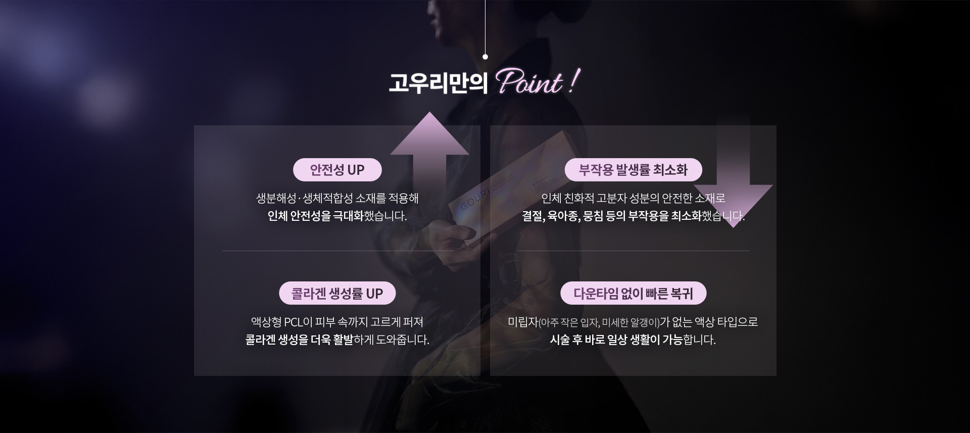 부작용 발생률 최소화 인체 친화적 고분자 성분의 안전한 소재로 결절, 육아종, 뭉침 등의 부작용을 최소화했습니다.